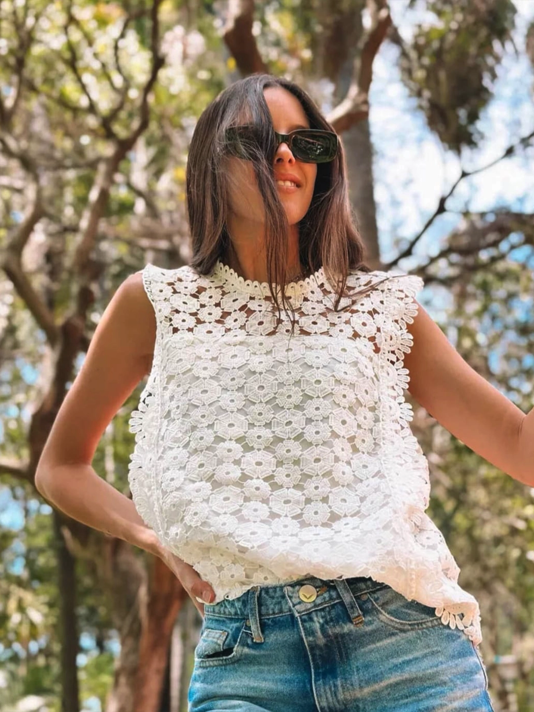 Blusa Laya es una blusa calada con forro y cierre con botón trasero.